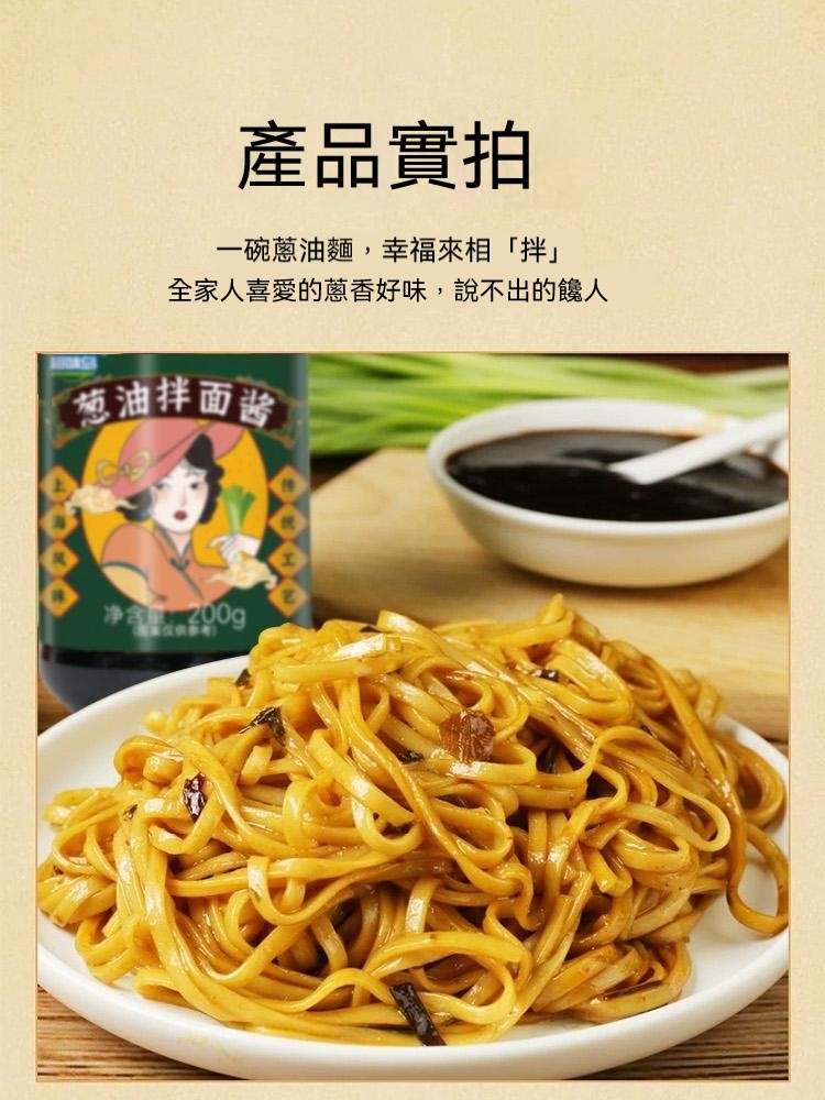 15分鐘前醇厚麵醬,完美搭配麵食,展現獨特風味 ,五分鐘就能吃上的蔥油拌面 ,無需繁瑣步驟 ,開瓶即食 油潤蔥香即刻享用 ,增鮮提香 ,秒變大廚 ,飯或者面都能一勺搞定 - 【家庭囤貨裝】6入組-NT$1380