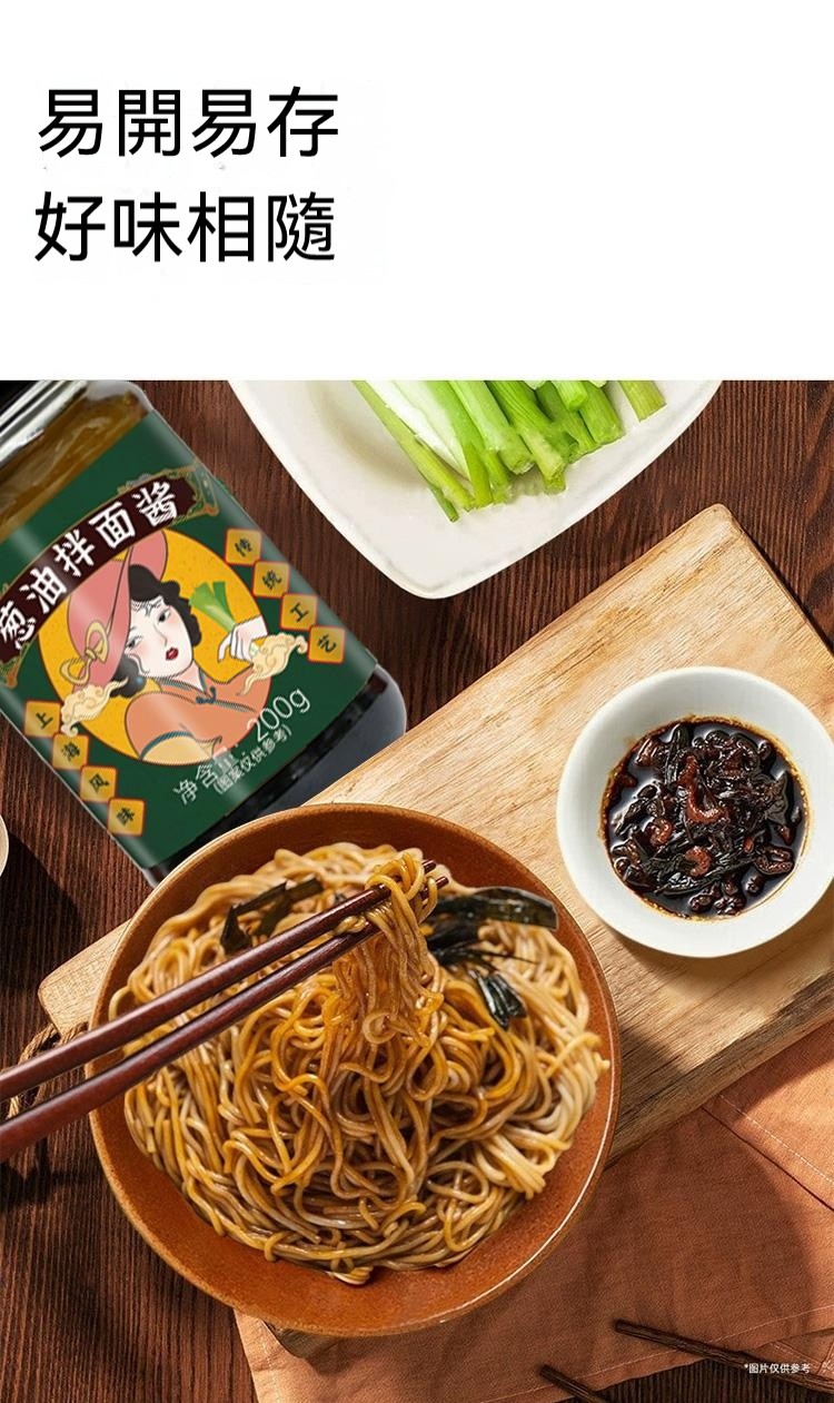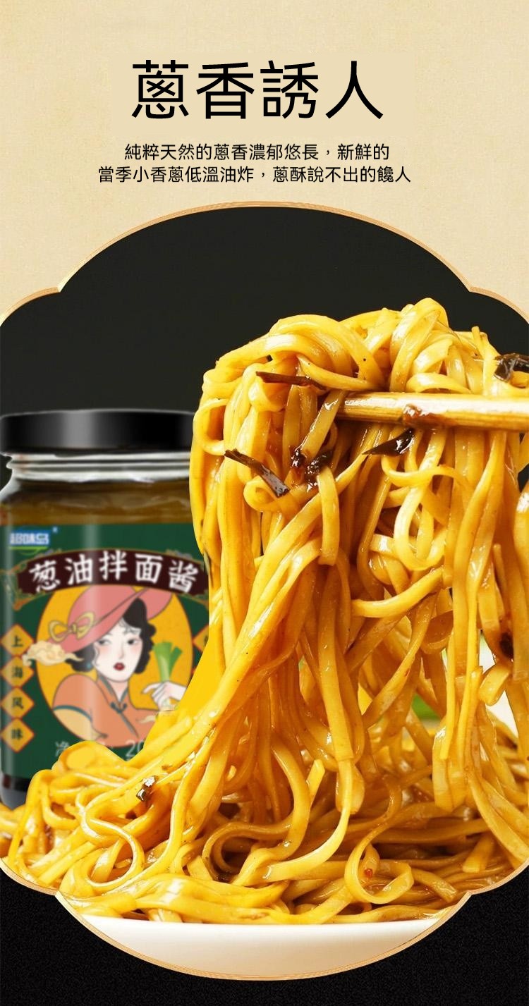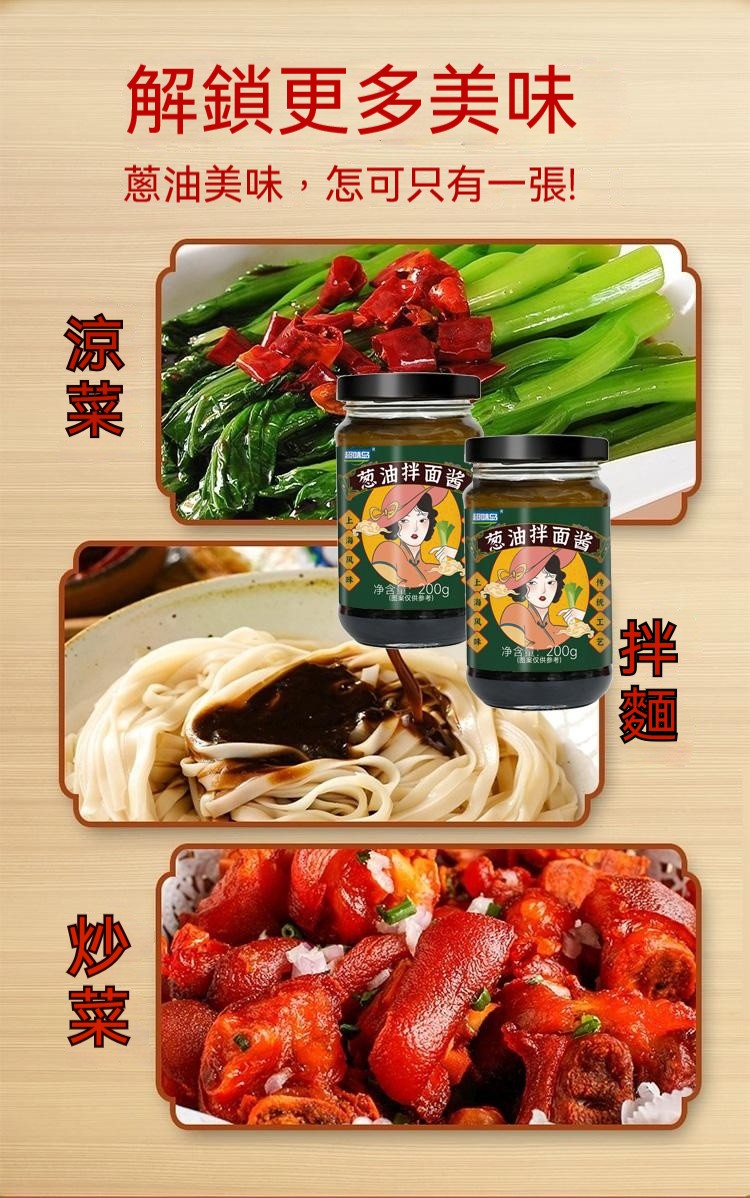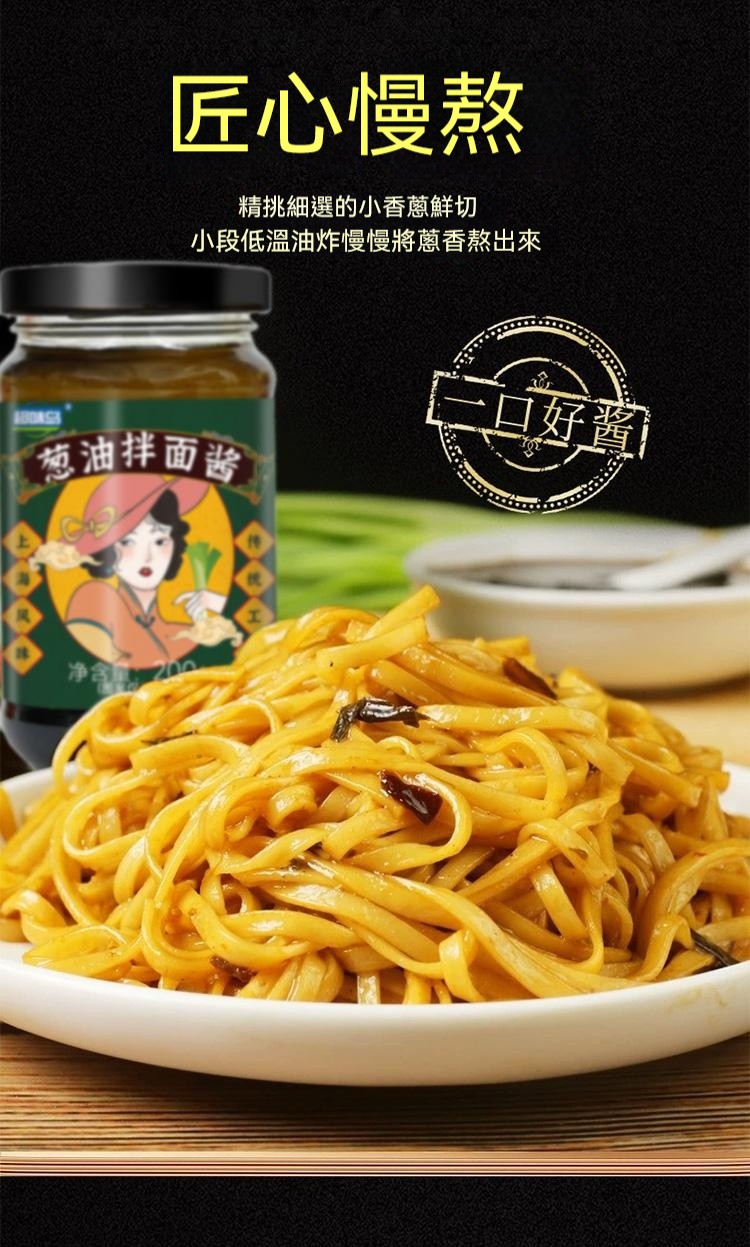4分鐘前醇厚麵醬,完美搭配麵食,展現獨特風味 ,五分鐘就能吃上的蔥油拌面 ,無需繁瑣步驟 ,開瓶即食 油潤蔥香即刻享用 ,增鮮提香 ,秒變大廚 ,飯或者面都能一勺搞定 - 【體驗嘗鮮價】2入組-NT$980