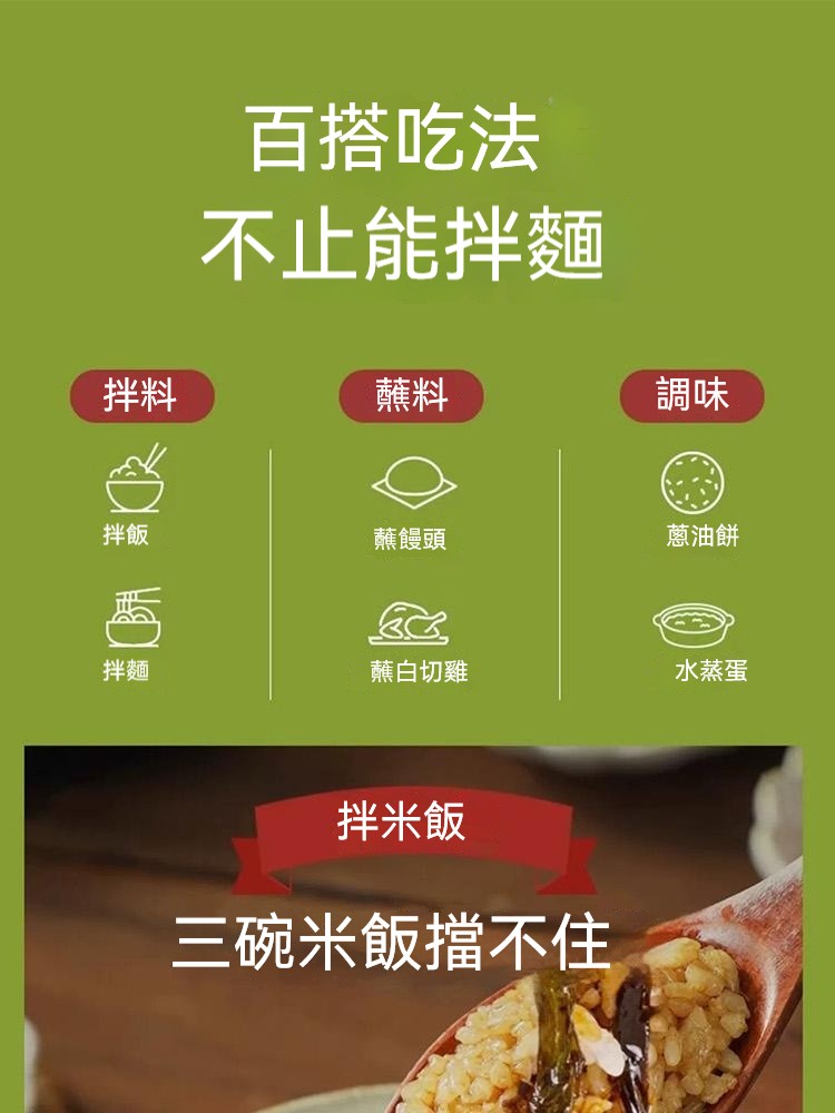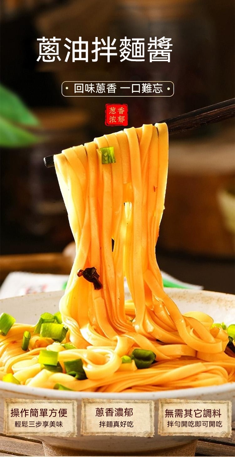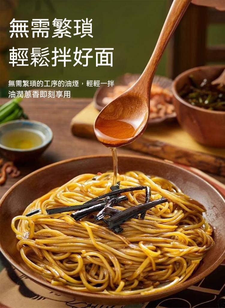 2分鐘前醇厚麵醬,完美搭配麵食,展現獨特風味 ,五分鐘就能吃上的蔥油拌面 ,無需繁瑣步驟 ,開瓶即食 油潤蔥香即刻享用 ,增鮮提香 ,秒變大廚 ,飯或者面都能一勺搞定 - 【98%客戶選擇】4入組-NT$1180