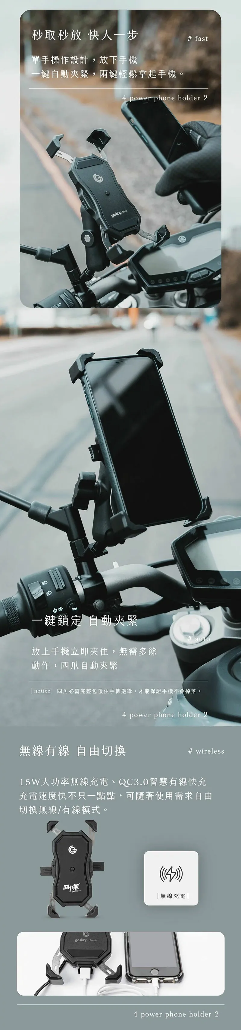 7分鐘前GC 四力架2 / 2s 單手操作 快人一步 最新四力架2 Pro 自動夾緊 USB充電 無線充電兩用機車手機架 外送必備 接單神器 - 四力架2s(通用快充版)一入組NT$1,080