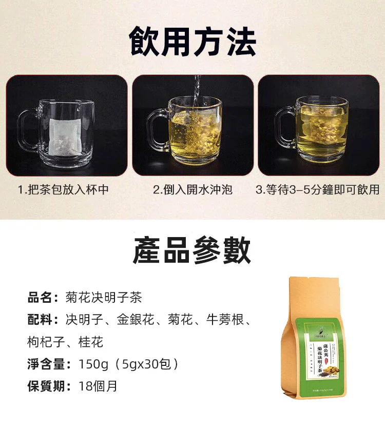 5分鐘前 蒲公英菊花決明子茶:養肝好茶!每天兩杯,養肝補腎,預防三高,保心護肝!【適合】熬夜加班、臉色不佳、容易長痘、口有異味、狀態不佳、掉髮、長斑、脾氣暴躁、有贅肉、降血壓! - 【體驗裝-明目降火】買一送三 4入組-NT$998