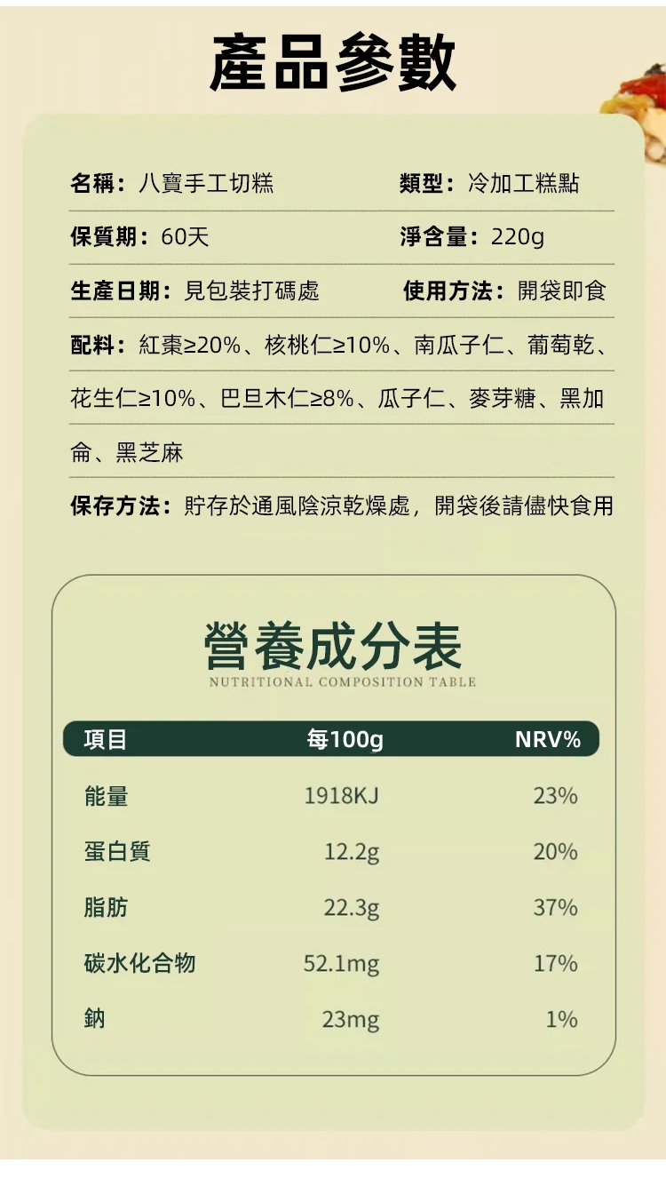 12分鐘前【*國際美食2星獎*養生食品首選!老師傅正宗手作切糕,純天然八寶堅果+五穀粗糧,無蔗糖無添加,飽腹代餐,營養均衡,老幼孕放心吃】傳統老式手工糕點,0添加蔗糖更健康 純手工製作手工堅果切糕 营养健康,家里有老人小孩的必须准备的零食坚果! - 【1袋/220g】嘗鮮,僅需799